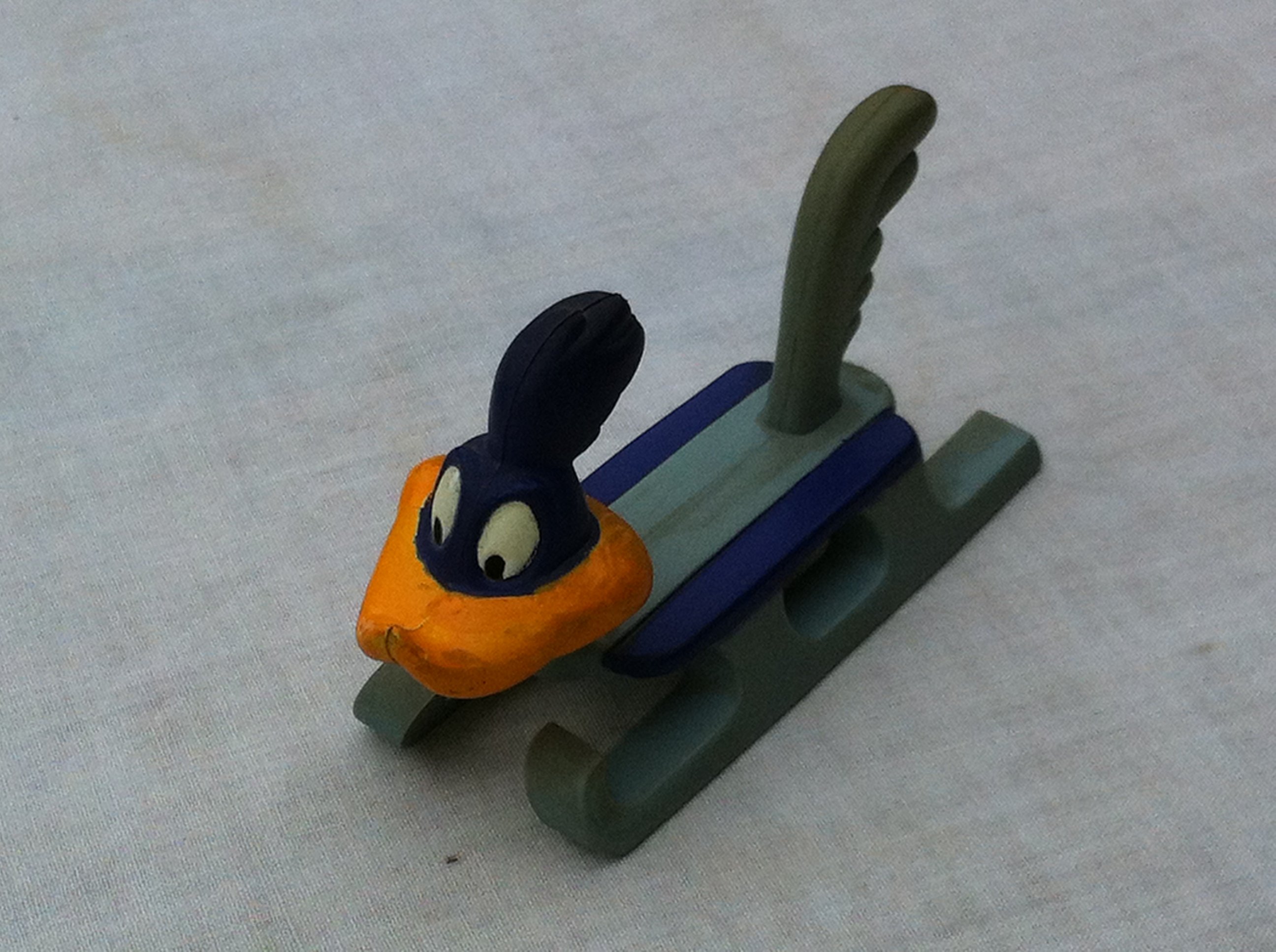 The lack of steering wheel is canonically correct. From the very beginning, many real bobs were steered by rope and pulley. It’s said piloting a bob has more in common with steeplechase riding than with race driving.