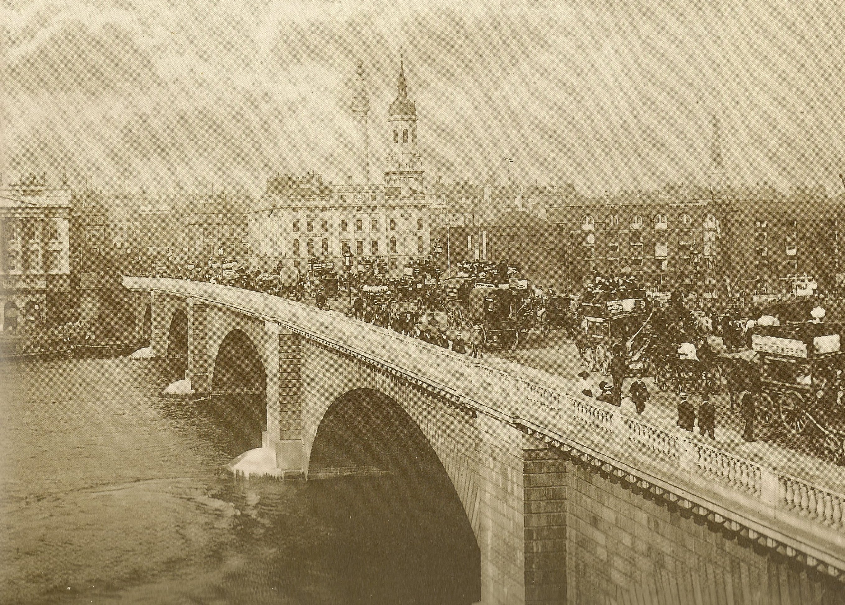 “At London Bridge, Holmes wrote a telegram to his brother…” From “The Adventure of the Bruce-Partington Plans.” Image of a heavily traveled London Bridge, 1891, from Viney. The bridge was dismantled in the 1960s and rebuilt in Lake Havasu, Arizona.