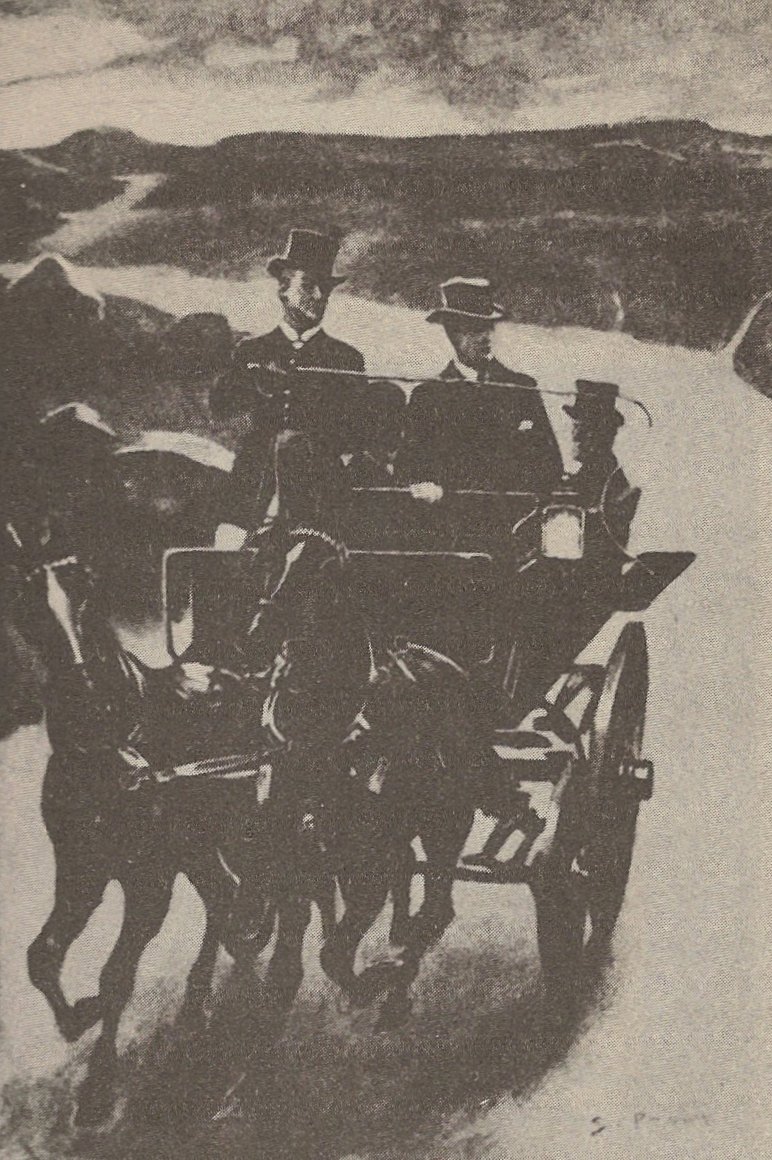 “Outside, beyond the low, white fence, a wagonette with a pair of cobs was waiting.” From “The Hound of the Baskervilles.” Image by Sidney Paget, from Baring-Gould.