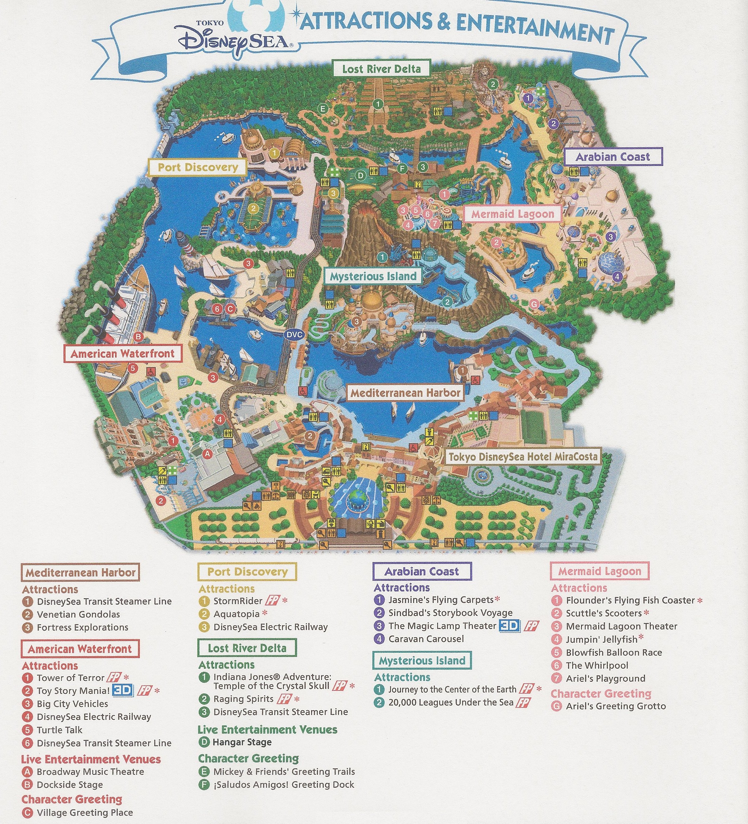 DisneySea has seven “ports of call,” Mediterranean Harbor, Mysterious Island, Port Discovery, American Waterfront, Lost River Delta, Arabian Coast and Mermaid Lagoon. Each has rides, shows, shops and restaurants reflecting these locales.