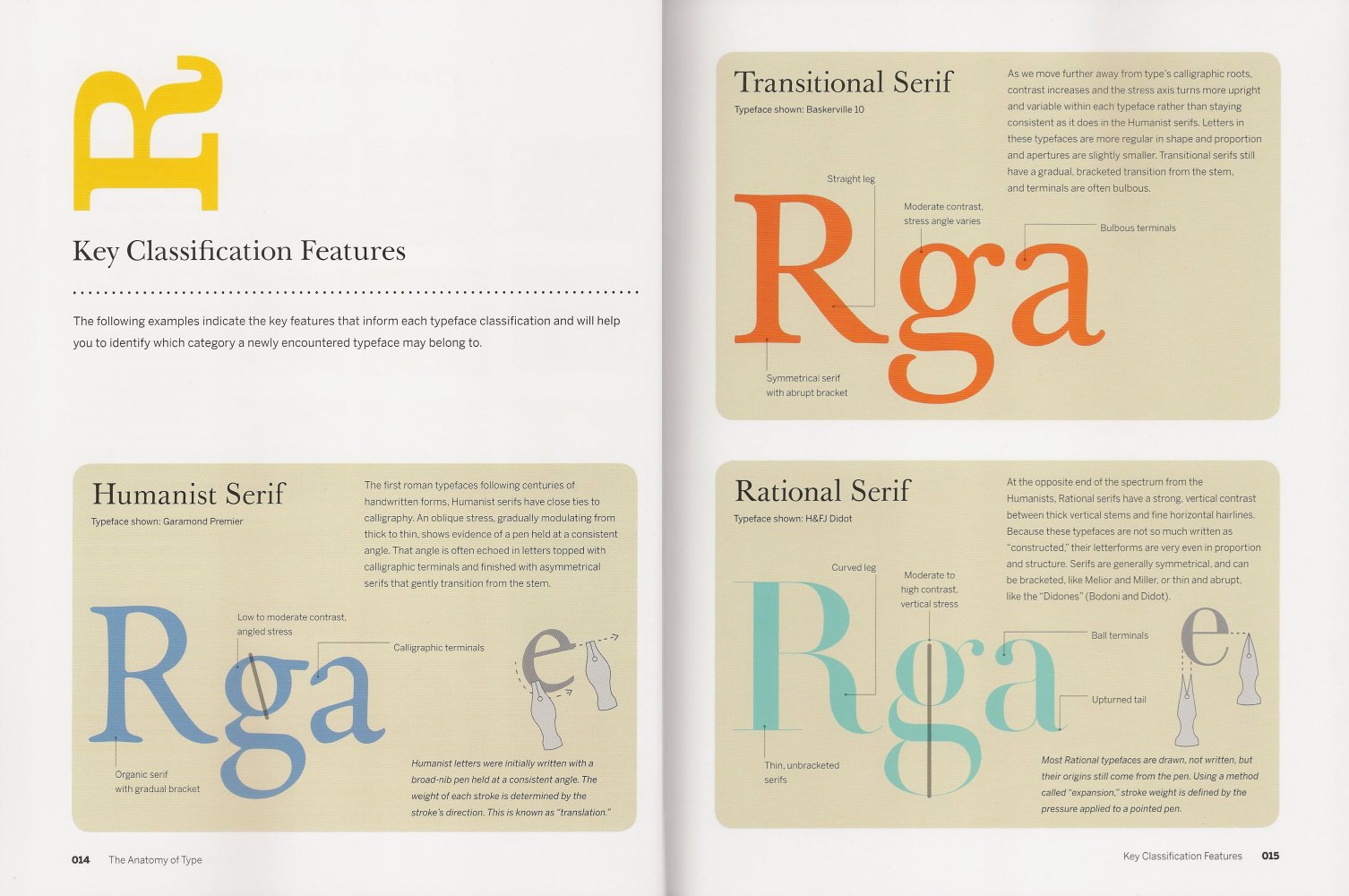 Three Serif examples, Humanist, Transitional and Rational. This and images following from Anatomy of Type.