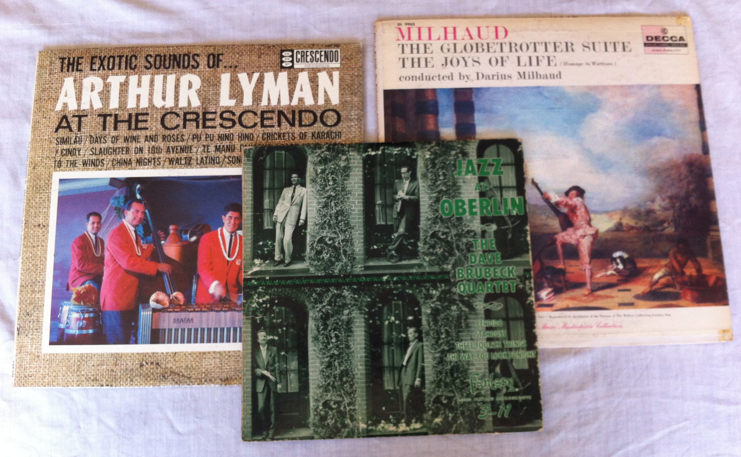 Vinyl 10- and 12-in. LPs (“Long Playing”), 33 1/3 rpm. From left to right, “The Exotic Sounds of Arthur Lyman at the Crescendo,” (meh?); “Jazz at Oberlin: The Dave Brubeck Quartet,” (worn, replaced in CD); “Milhaud: The Globetrotter Suite, The Joys of Life (Homage to Watteau),” (savor the original).
