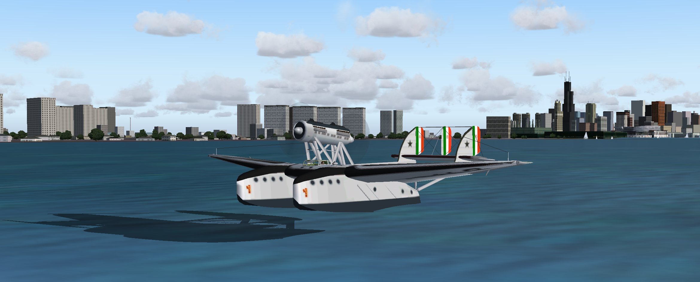 Balbo’s Savoia-Marchetti SM.55X touches down onto Microsoft Flight Simulator’s Lake Michigan. The model, by flight simmer Massimo Taccoli.