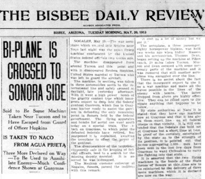 The Bisbee Daily Citizen reported “that the aeroplane crossed into Mexico yesterday afternoon in daylight, accompanied by a high-powered bomb of the gravity-contact type.”