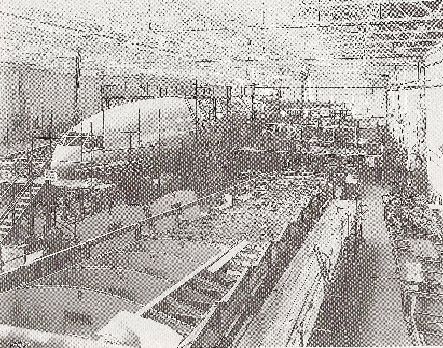 The skinning of the fuselage approaches completion, February 1947. In the foreground, a wing is being fabricated. Image from Brabazon.