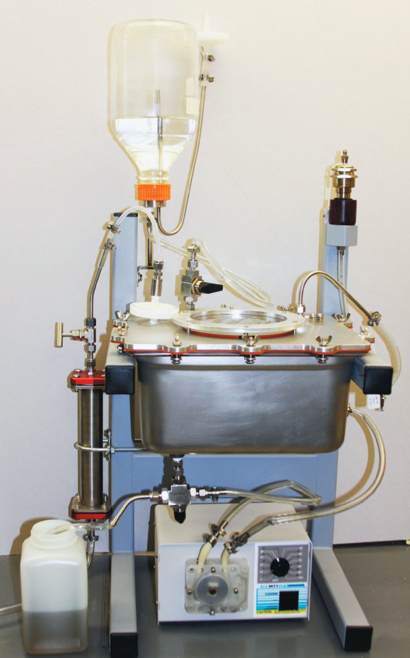 His experimental apparatus, a Paleobiosphere, resembles a laundry sink with additional hoses, seals and fittings.