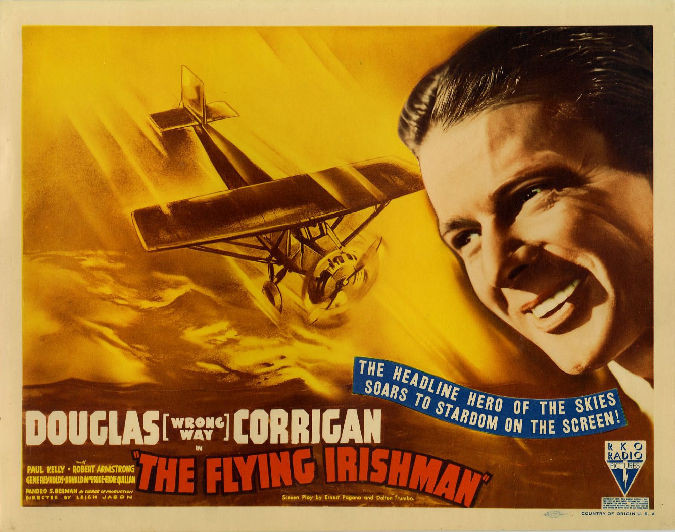 Corrigan’s celebrity continued. He wrote That’s My Story, published in time for the 1938 Christmas market. He endorsed a Wrong Way Corrigan wristwatch that, naturally, ran backwards. Within a year, RKO Radio Pictures paid him $100,000 for rights to his book for The Flying Irishman, starring no less than Douglas Corrigan. (See http://goo.gl/MzeA4L.)