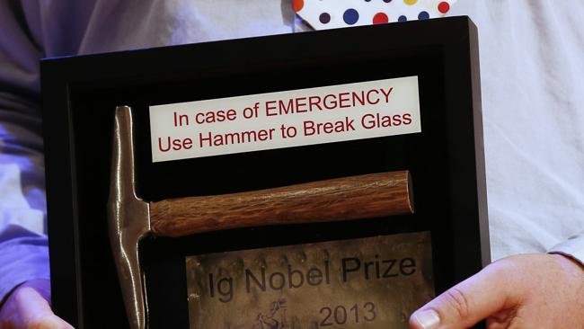 IG NOBEL Prizes for 2013 have been announced. These annual honors are organized by the Annals of Improbable Research magazine and co-sponsored by the Harvard-Radcliffe Society of Physics Students and the Harvard-Radcliffe Science Fiction Association. See http://goo.gl/tfCnH for the website and portal to the organizers’ many activities.