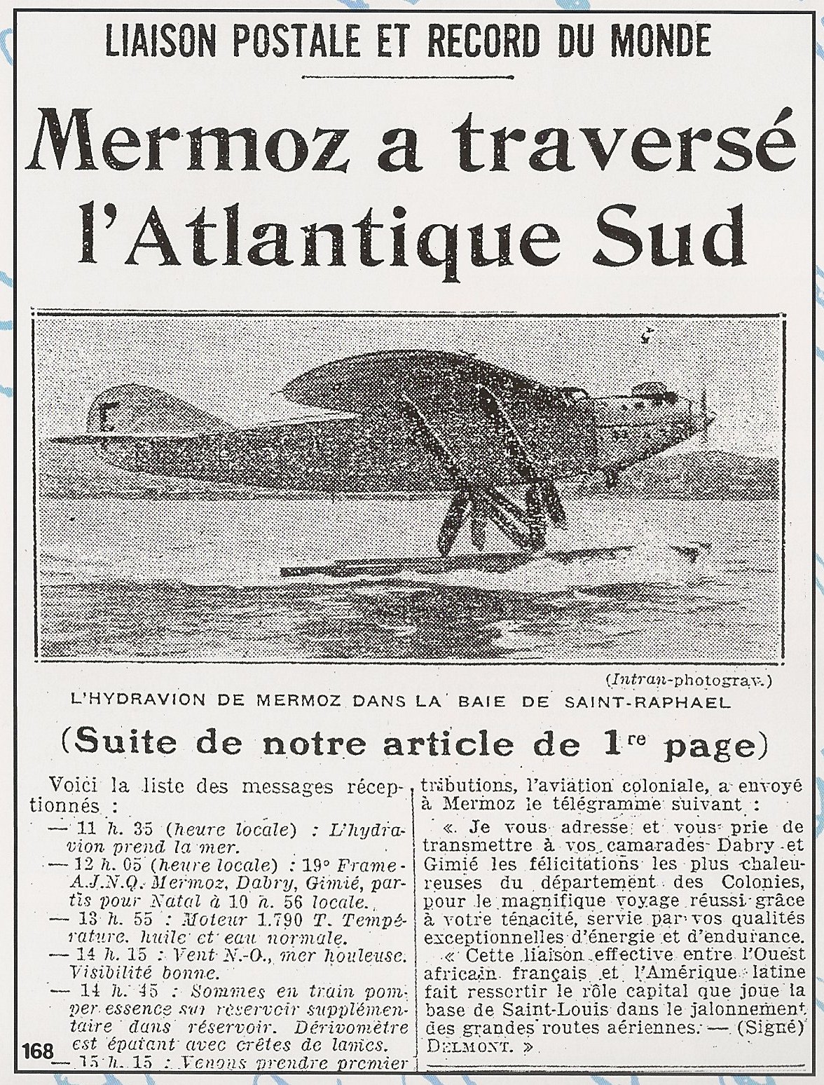 In 1930, Mermoz piloted a Latécoère float plane in the first non-stop crossing of the South Atlantic, from Dakar, Senegal, to Natal, Brazil. Hitherto, all mail had gone by boat.