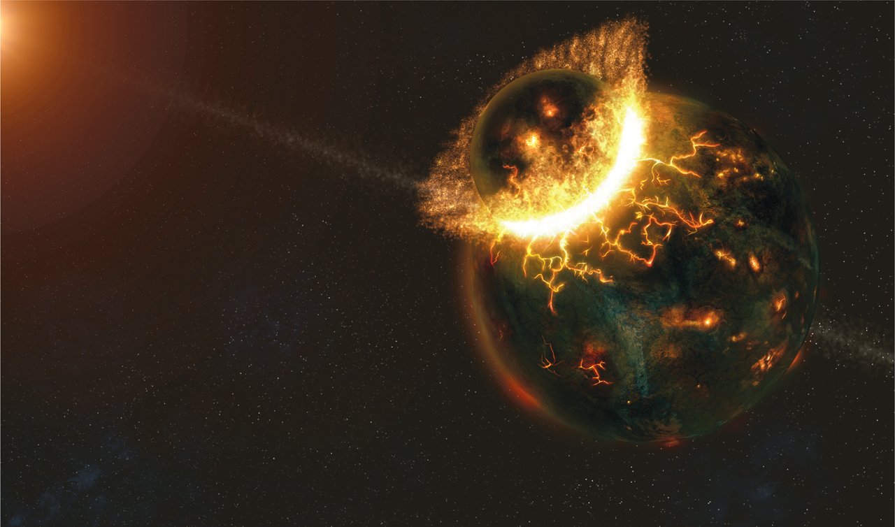 The Giant Impact Theory suggests the moon arose from a collision of Earth with a Mars-sized planet. Image by Fahad Sulehvia http://www.novacelestia.com from Science magazine, October 11, 2013.
