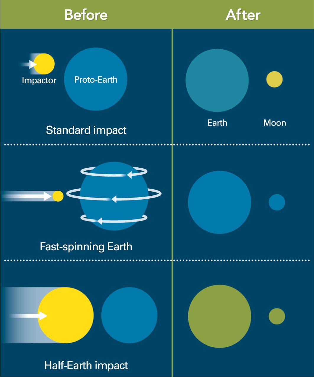 A second model, Fast-spinning Earth, grants a chemically different collider and yields a homogeneous Earth and moon. But it requires a smallish errant planet, perhaps only 1/200 as massive as Earth, moving at high speed and impacting a fast-spinning Earth. Its shortcoming is dealing with all the increased dynamics and angular momentum (twice the Earth/moon pair’s today).