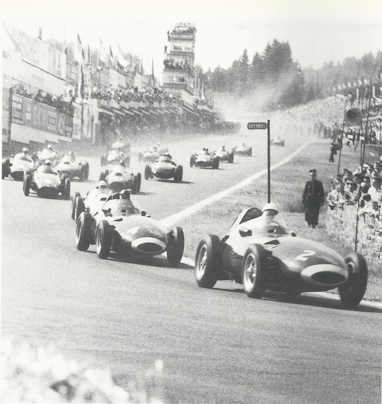 Moss leads teammate Brooks at Belgium’s Spa-Francorchamps Eau Rouge, 1958; Moss DNF’d. Brooks won. Image from Brooks.