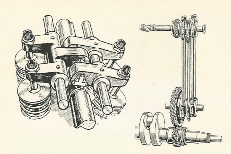 The camshaft drive is especially novel: A mini three-throw crankshaft is gear-driven off the engine’s crankshaft. Vertical connecting rods link this to another mini crankshaft integrated into the overhead camshaft.