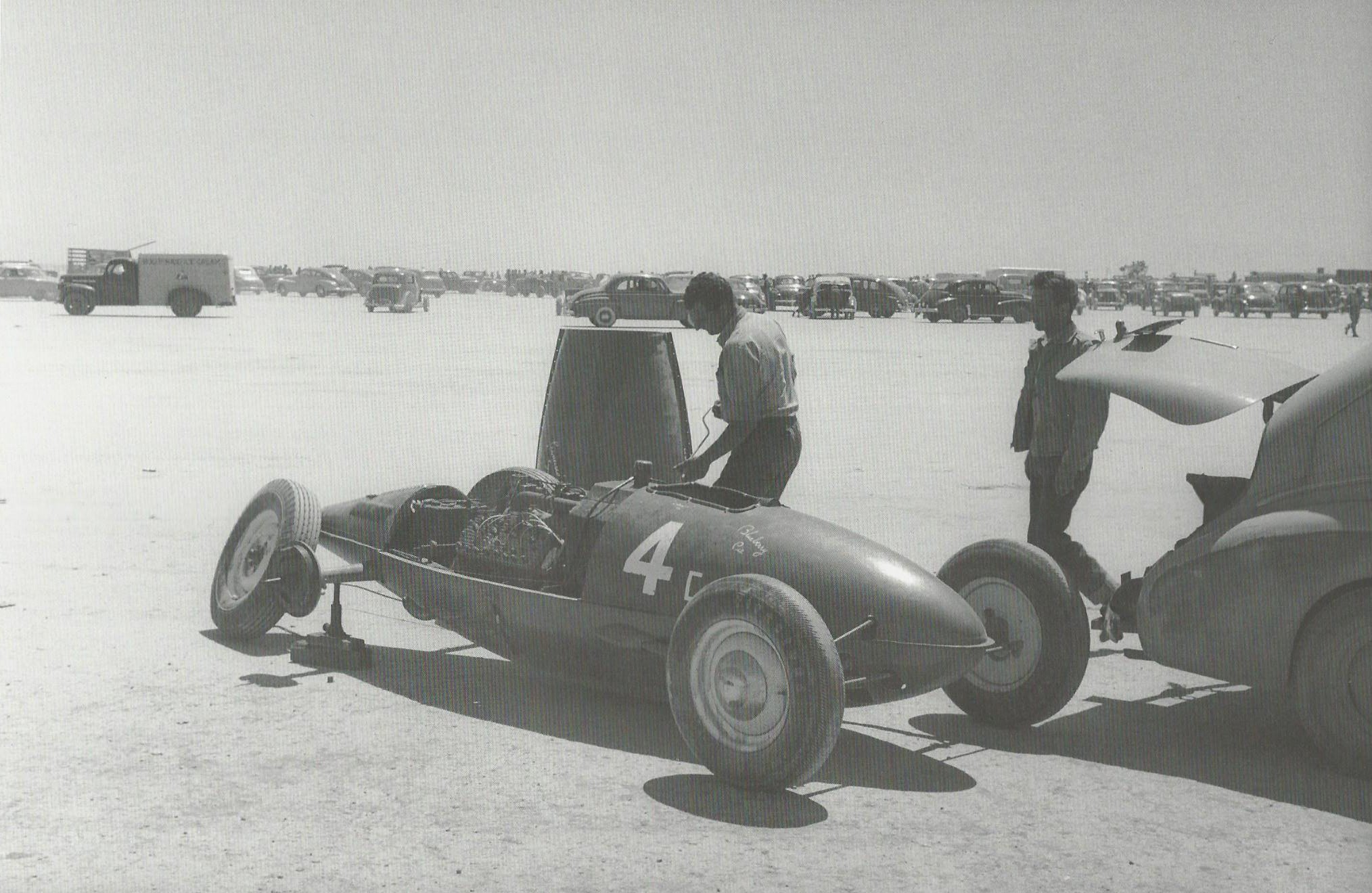 The dry lakes of Southern California—no more than a couple of hours inland from the coast—provided vast expanses on which to compete for top speed. Mac brought his Leica to these venues as well.