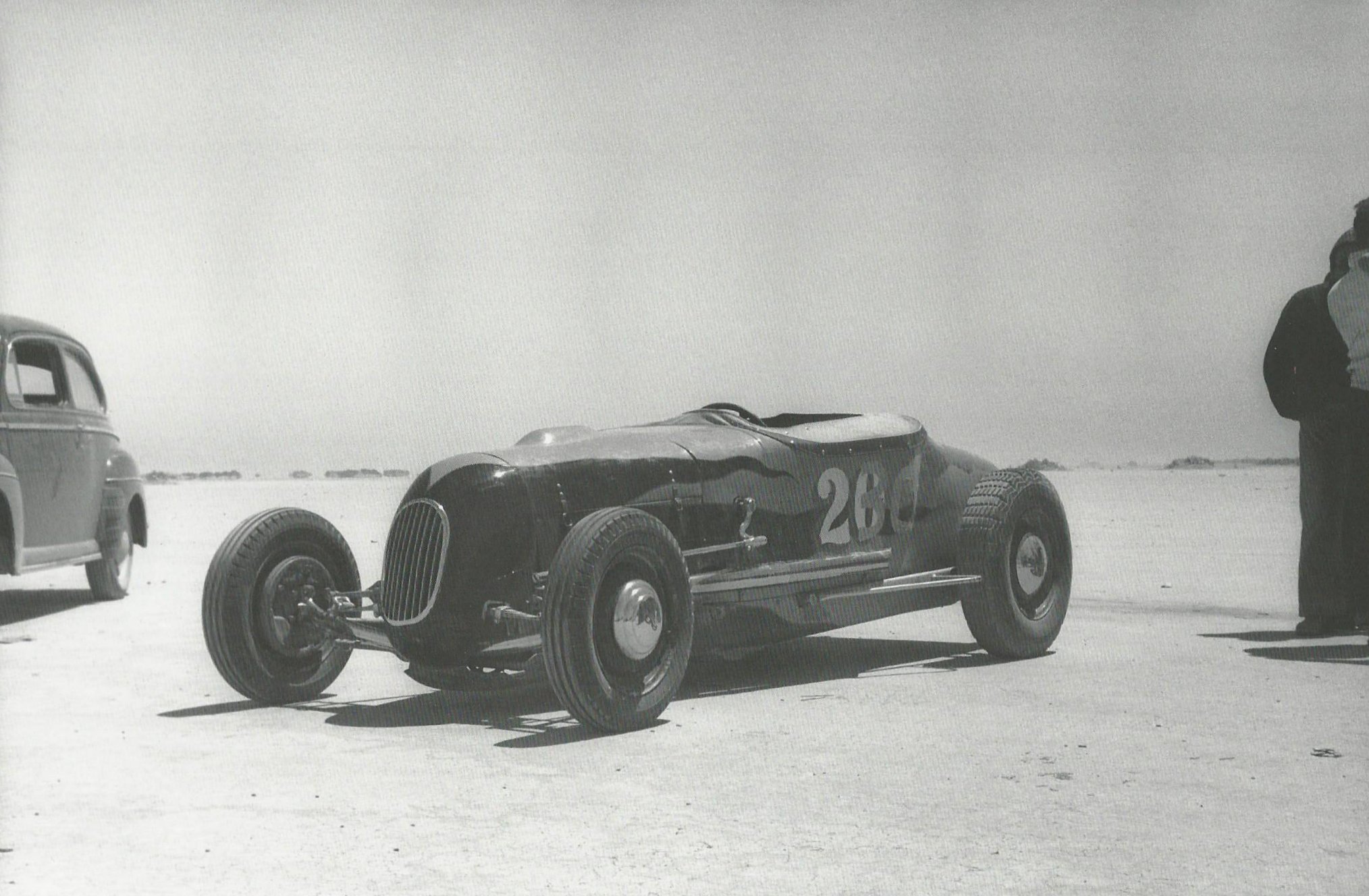 World War II fighters carried detachable fuel tanks for extended missions. Postwar hot rodders appreciated their streamlined shapes—and war-surplus prices. As these streamliners evolved, their V-8 engines moved aft of the driver, the chassis derived from Ford Model T rails.