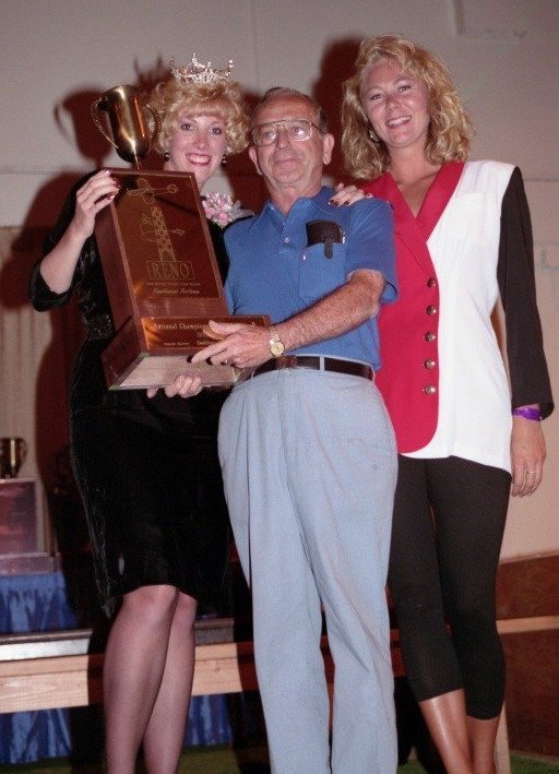 Jim Miller celebrates a Formula One victory in 1991 with Miss Reno 91, Amanda Allman, left, and Miss Reno 90, Jennifer Eckert, right. Image by Don Bucky Dawson.