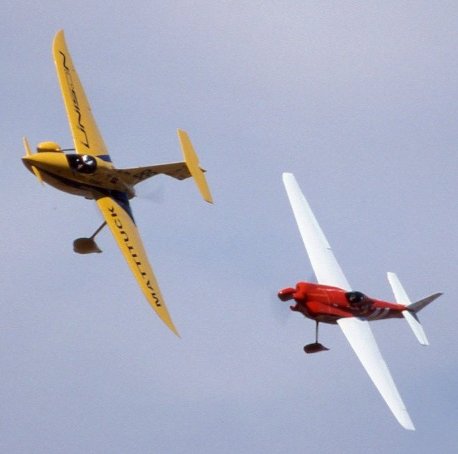 Pushy Galore also set three records recognized by the Fédération Aéronautique Internationale, all involving time to altitude. It and Pushy Cat also competed in AeroShell 3D Speed Dashes, straightline competitions akin to aerial Bonneville runs. Check out http://goo.gl/Dd4oyn for a retrospective look at the 1993 AeroShell event, including a brief chat with Jim Miller.
