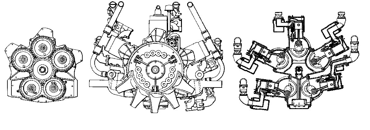Five-Pack details: from the left, crankshaft gears drive a central output gear; complete view from flywheel end; cylinder alignment.