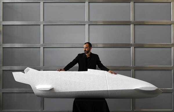 Michael Scully of BMW DesignworksUSA shows an early foam mockup of the BMW bobsled design. Image by Brian van der Brug/The Los Angeles Times. See “Bobsled designer races to craft a U.S. winner,” in The Los Angeles Time, February 7, 2014; http://goo.gl/vOco3h.