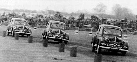 A trio of Dyna Xs scrabble through Silverstone’s Copse Corner in May 1951. Drivers are Ron “Curly” Dryden, Peter Collins (later to achieve world driving fame) and motoring journalist Gordon Wilkins. Image from http://goo.gl/Yo7o5U.