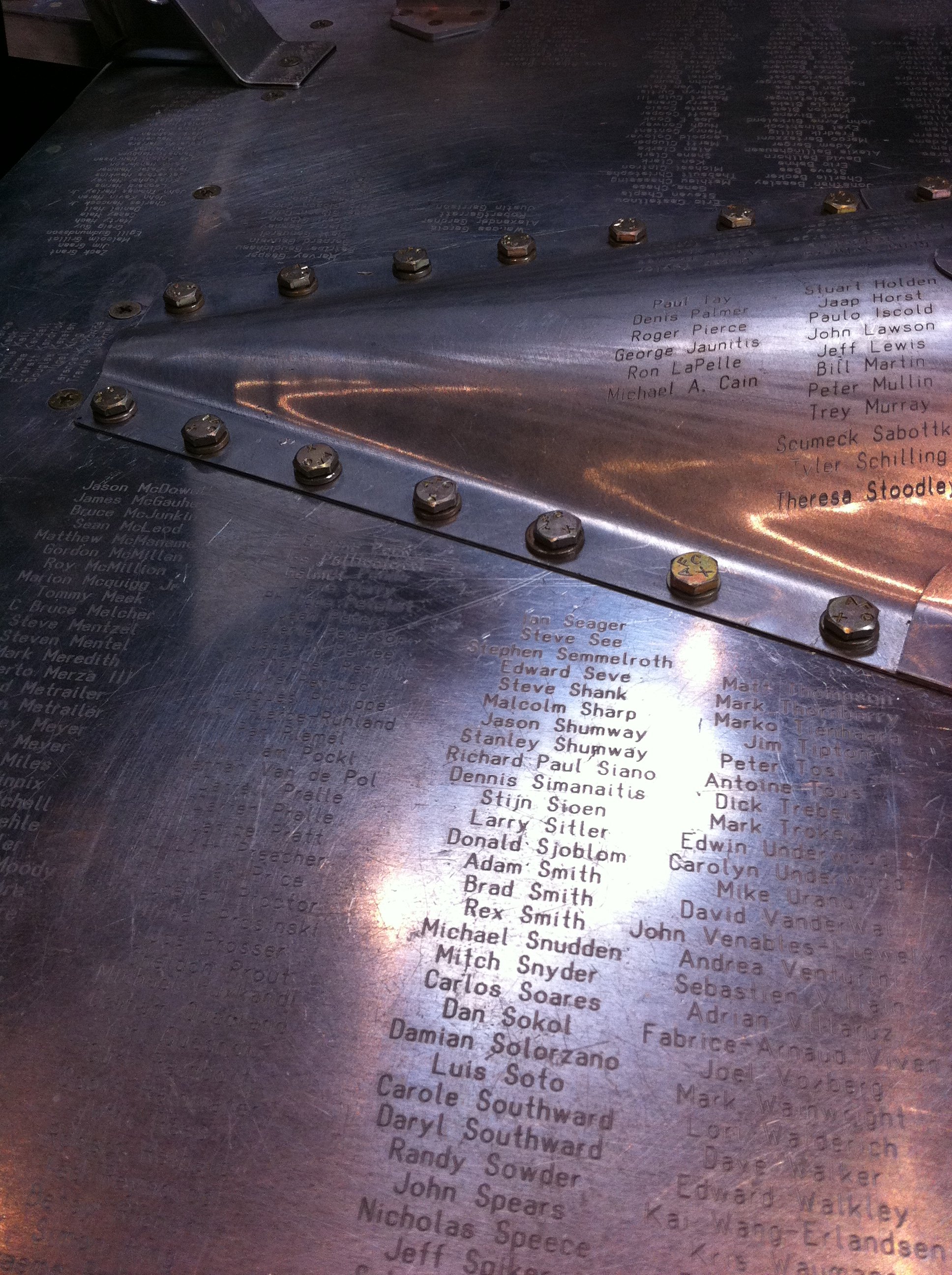 The bulkhead immediately forward of the Reve Bleu 100P’s instrument panel contains names of many of its Kickstarter contributors.