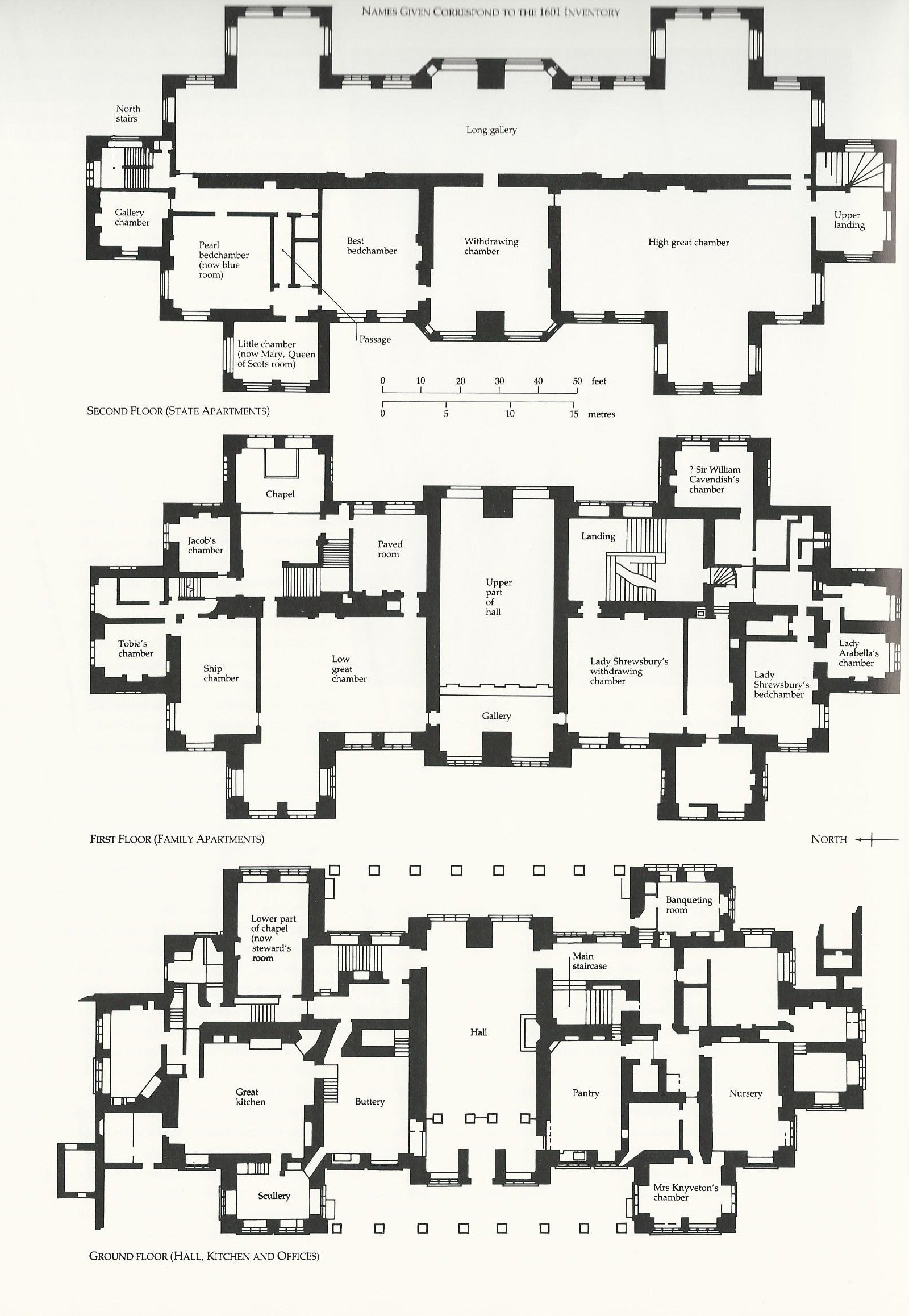 Hardwick Hall is Elizabethan, built 1590 – 1597, in Derbyshire, about 150 miles northwest of London. Jackson-Stops describes it as a Renaissance hunting lodge on a gigantic scale. Images from The English Country House in Perspective.