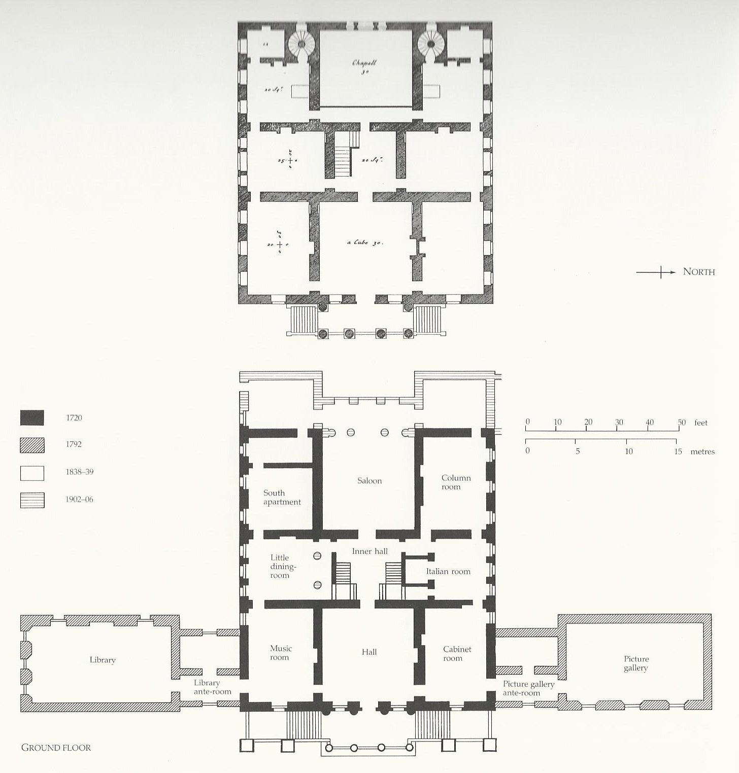 Stourhead, the east front with library and picture gallery flanking the original villa. Below, a floor plan showing expansion since its 1720 construction. Images from The English Country House in Perspective.