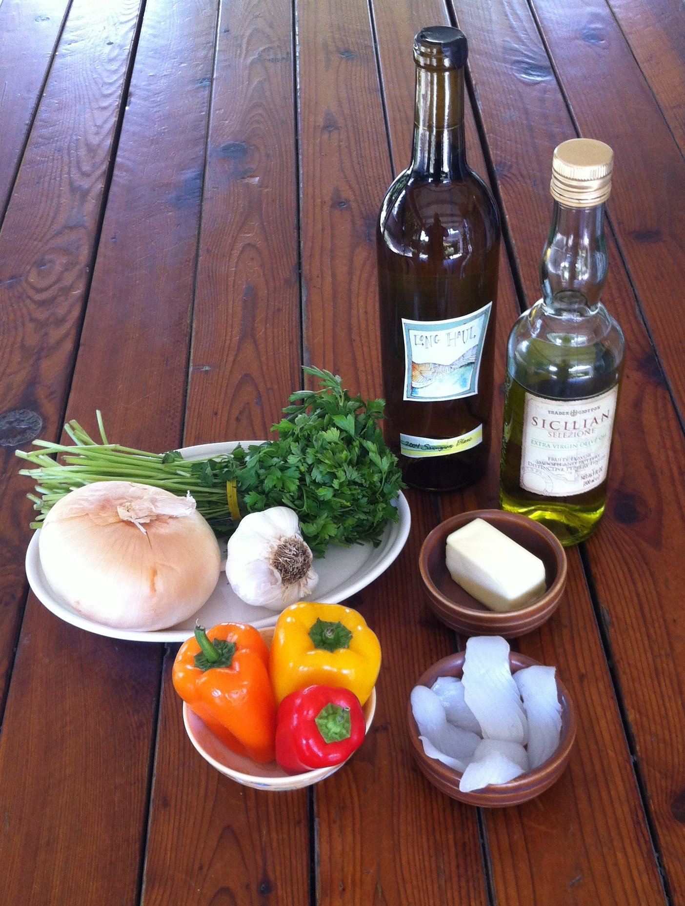 Squid, sweet peppers and onions, together with garlic, Italian parsley, white wine, butter and olive oil.
