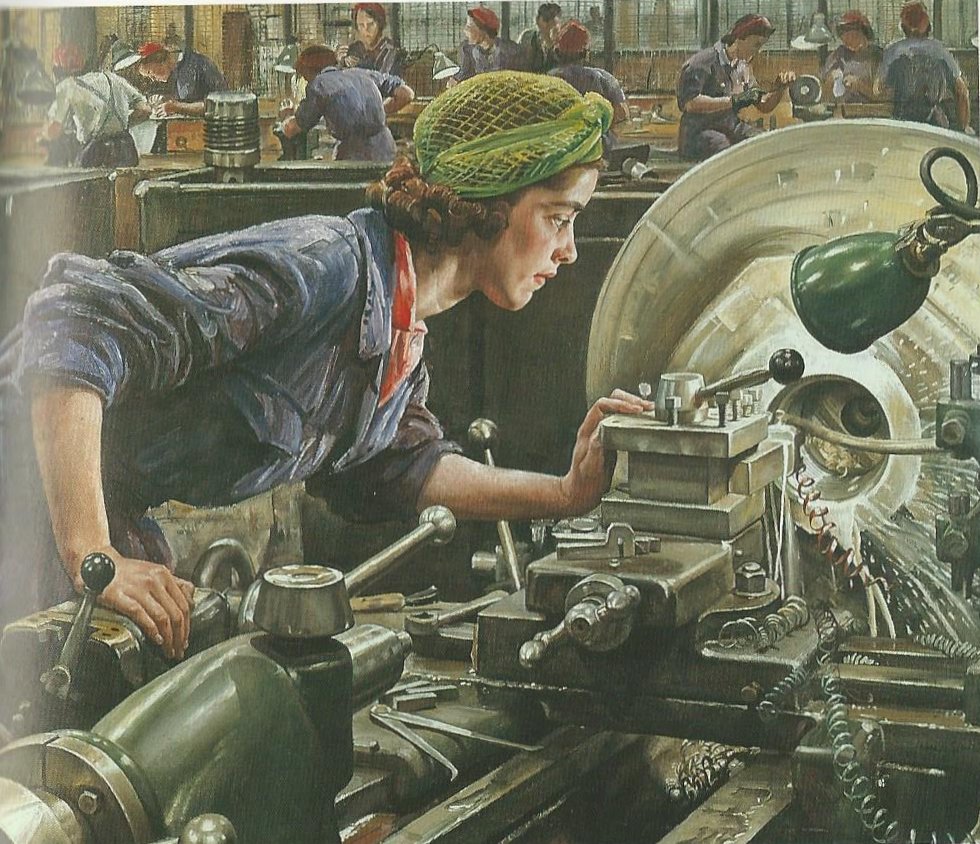 Ruby Loftus screwing a breech-ring, 1943, painting by Dame Laura Knight, inspired by the photo above. Image from Go To It!
