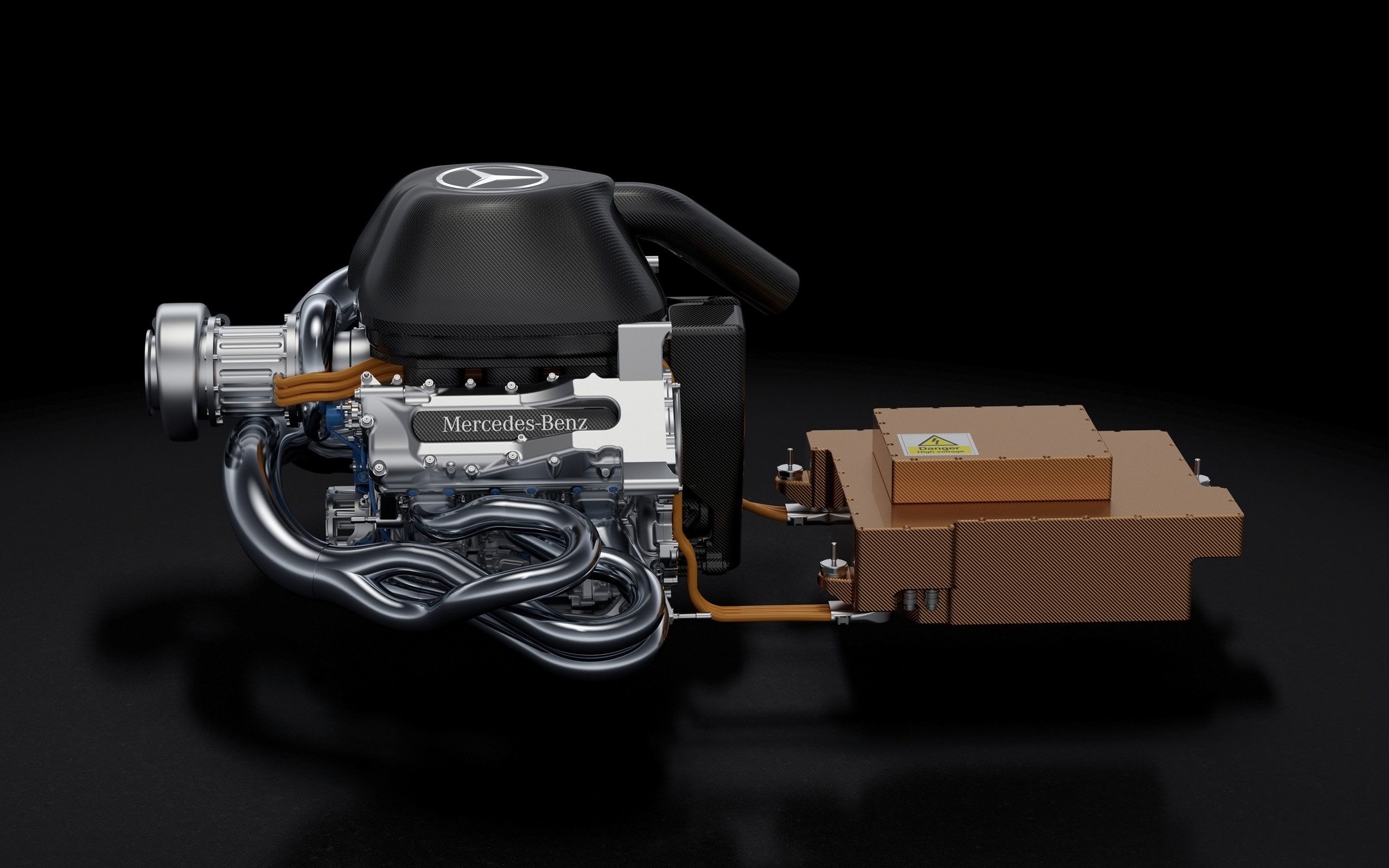 Mercedes AMG Petronas Formula 1 engine, viewed from the right. Its turbine is aft of the engine block at the rear. Its compressor resides under the three-pointed star enclosure. Forward of the block is the car’s hybrid battery pack.