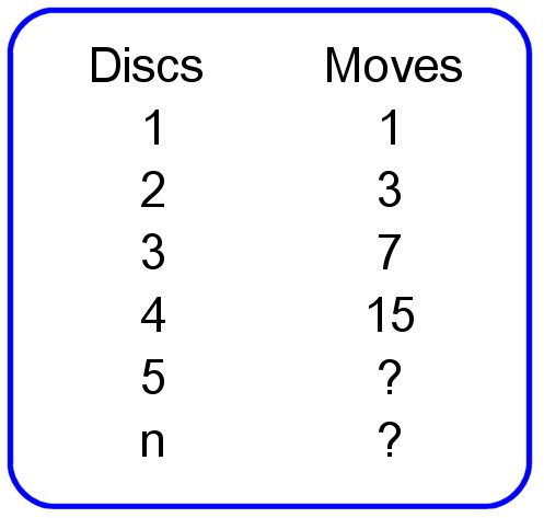 In fact, a Tower of Hanoi with five discs requires 31 moves; n discs requires 2n – 1 moves, a number that grows exponentially large.