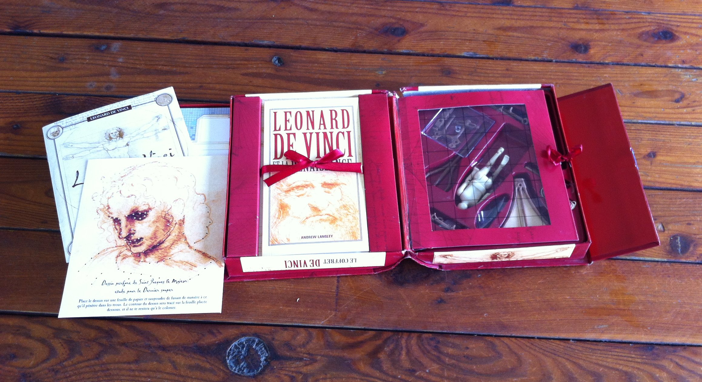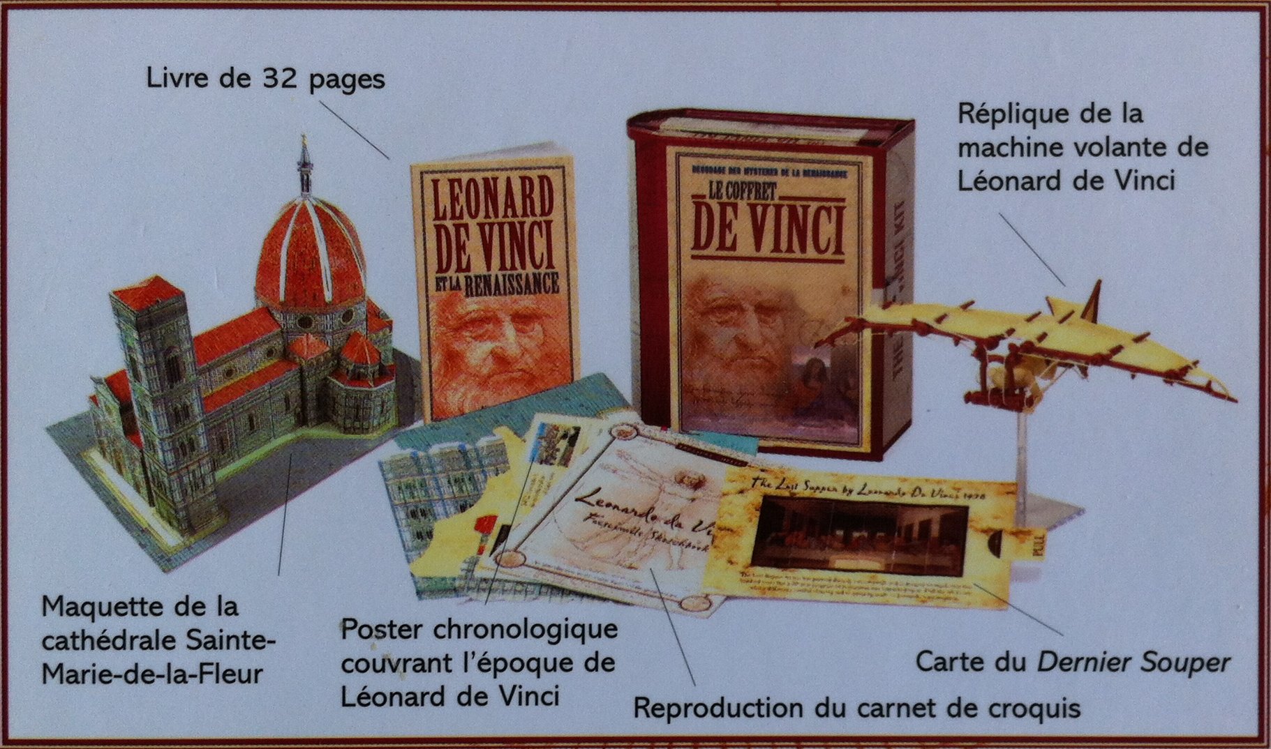 I found Le Coffret de Vinci in a bookshop in Ste. Germain-des-Prés on the Left Bank of Paris. This boxed collection (coffret is French for case) is more than a book. It’s a 32-page book, Leonardo de Vinci et la Renaissance, a paperboard model of the cathédrale Sante-Marie-de-la-Fleur, a time line of da Vinci’s era, a Grille of Alberti (used by Renaissance artists to establish perspective), a card showing Leonardo’s Last Supper (with its original colors as well as today’s faded version), a booklet of his scientific, engineering and anatomical illustrations (including Vitruvian Man, his correlation of ideal human proportions with geometry), and a plastic model of his ornithopter flying machine.