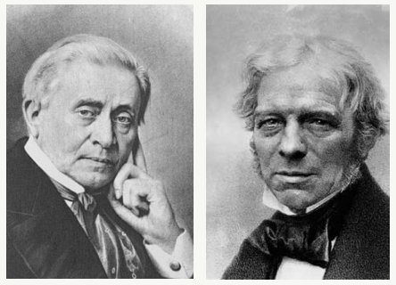 At left, Joseph Henry, 1797 – 1878, American scientist. At right, Michael Faraday, 1791 – 1867, English scientist. Co-discoverers of electromagnetic induction in 1831.