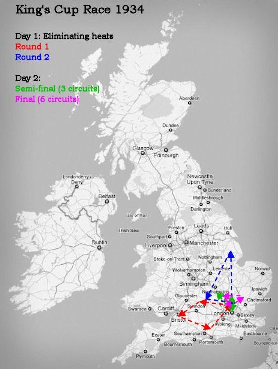 The 1934 King’s Cup Race was a two-day affair with two rounds of cross-country eliminating heats followed by semi-final and final circuits. The races were run with organizer’s handicap, a matter of some controversy.
