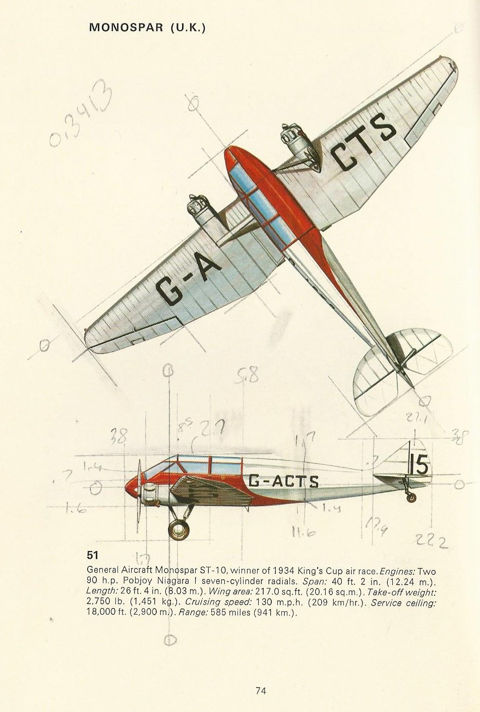 The prototype ST-10, registered G-ACTS, was GAL’s entry in the 1934 King’s Cup. Harry Schofield piloted the craft; its designer Helmuth Stieger flew as co-pilot. A brief Pathe newsreel of the event can be seen at http://goo.gl/IqSd6D.