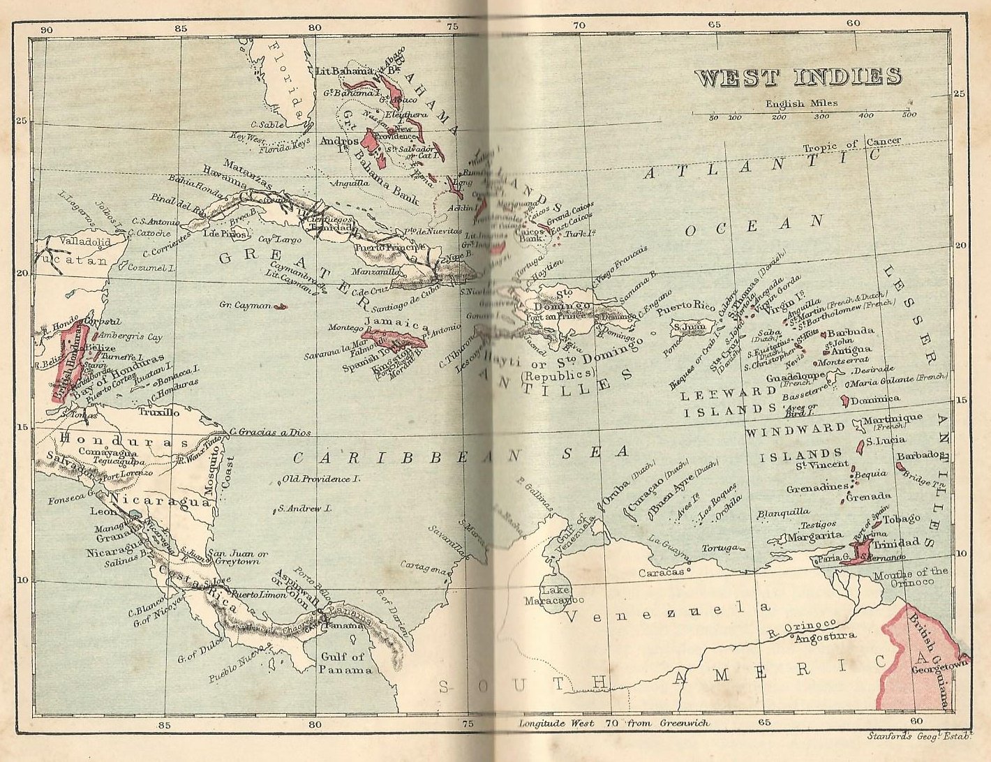Regions shown in red were outposts of the British Empire in 1912. Today, they’re a mixed array of sovereign states, Commonwealth realms and British Overseas Territories. This and other images from The Pocket Guide to the West Indies—Colonial Edition.