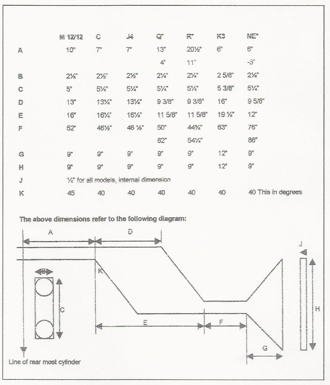 This chart gives dimensions of Brooklands silencers for a selection of vintage MGs, the M 12/12 through the NE. Image from “Brooklands Silencers—Or Do They?” (See http://goo.gl/kz9TAY.)