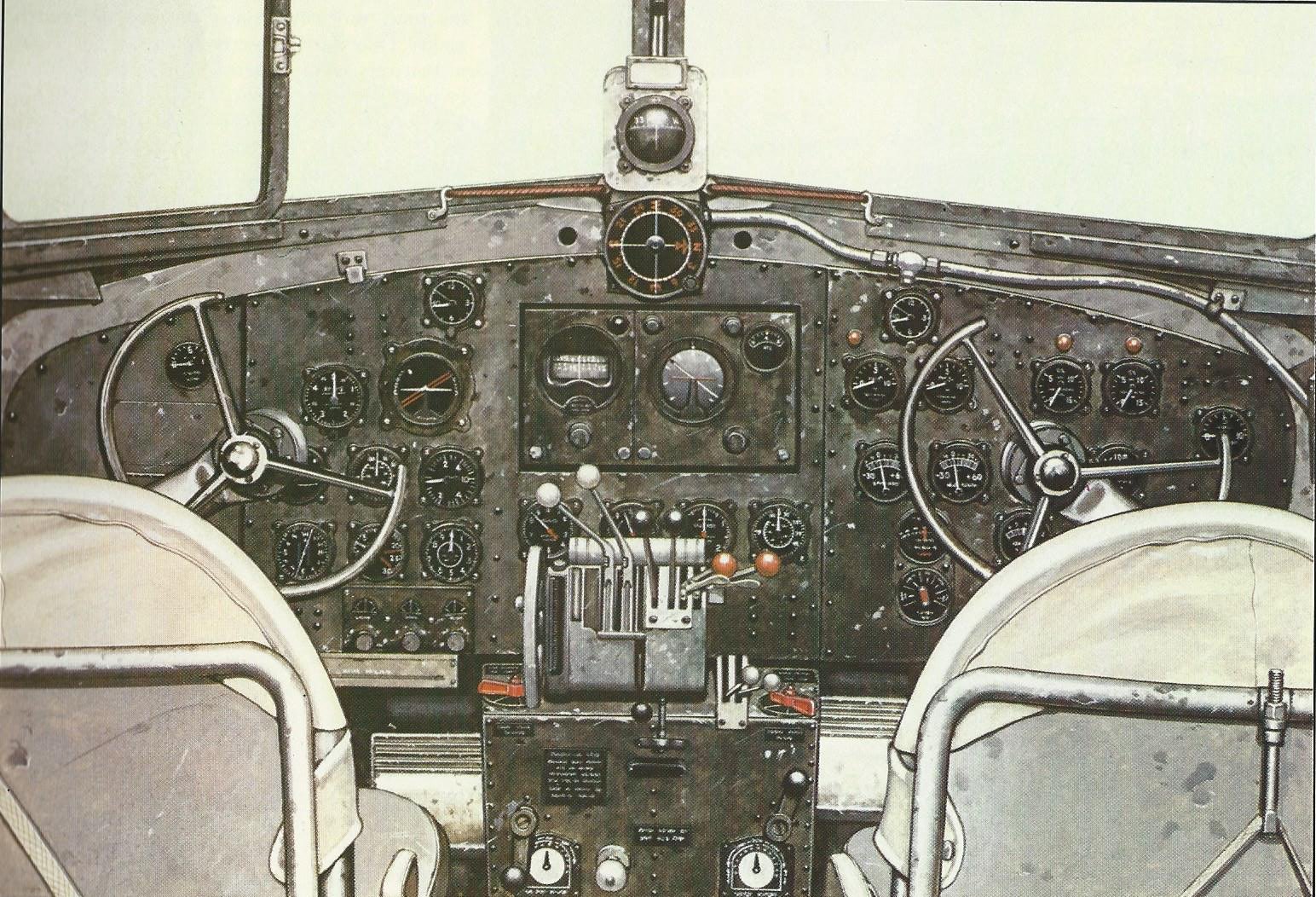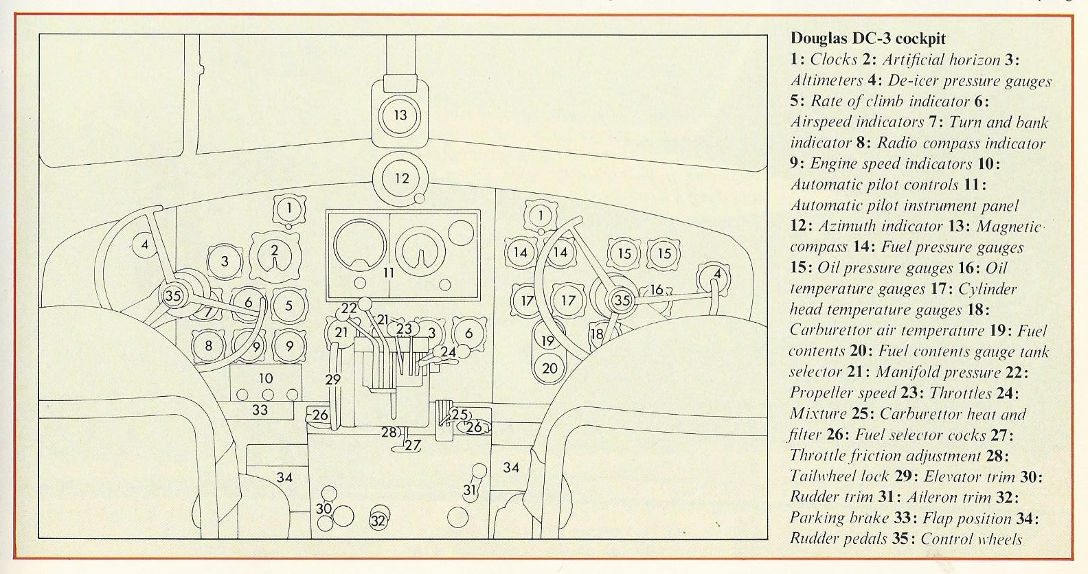 Above, a well-used flight deck of a DC-3. Below, a key to its instrumentation and controls. Images from In the Cockpit.