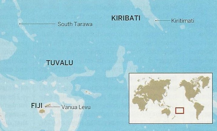 Kiribati consists of 33 atolls spread across an area the size of India. Map from Science, August 1, 2014 (http://goo.gl/E1cuXW).