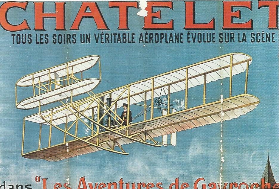 The Wright Flyer even made its mark in theater advertising. The Théâtre du Châtelet in Paris had been timely in 1876 staging Jules Verne’s Around the World in Eighty Days (the book, published three years earlier). And in 1909, the theater touted “Les Aventures de Gavroche,” in which it promised “every evening, a real aeroplane produced on stage.”