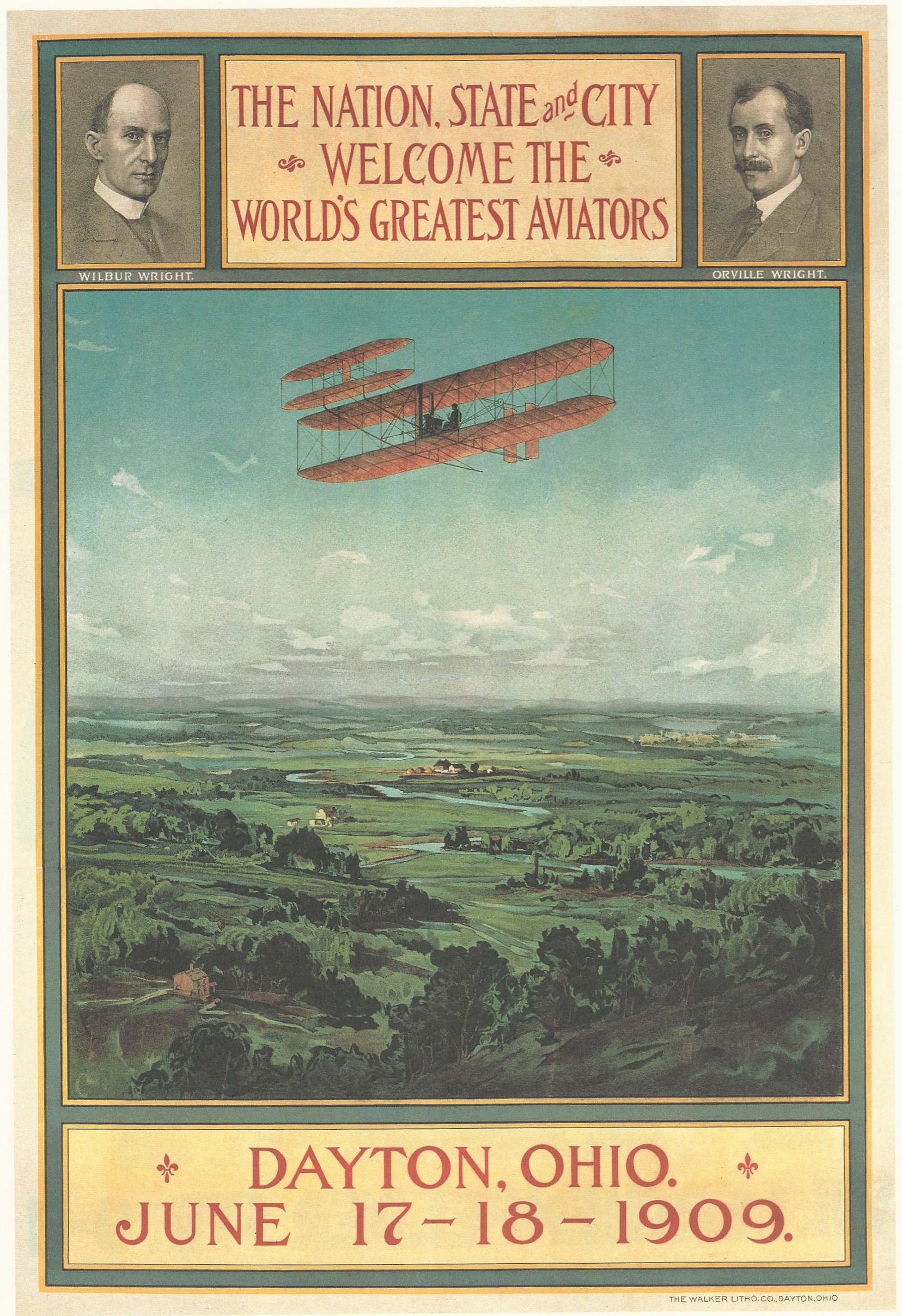 Poster celebrating the Wrights after Wilbur’s 1909 European exhibition. The Walker Litho. Co., Dayton, Ohio. Image from Looping the Loop: Posters of Flight.