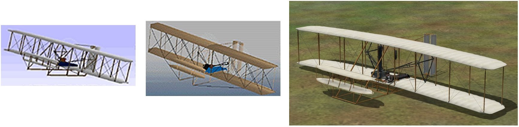 From left to right, my original Wright Flyer for FS4; my interim version; Microsoft’s rendering included in FS9.