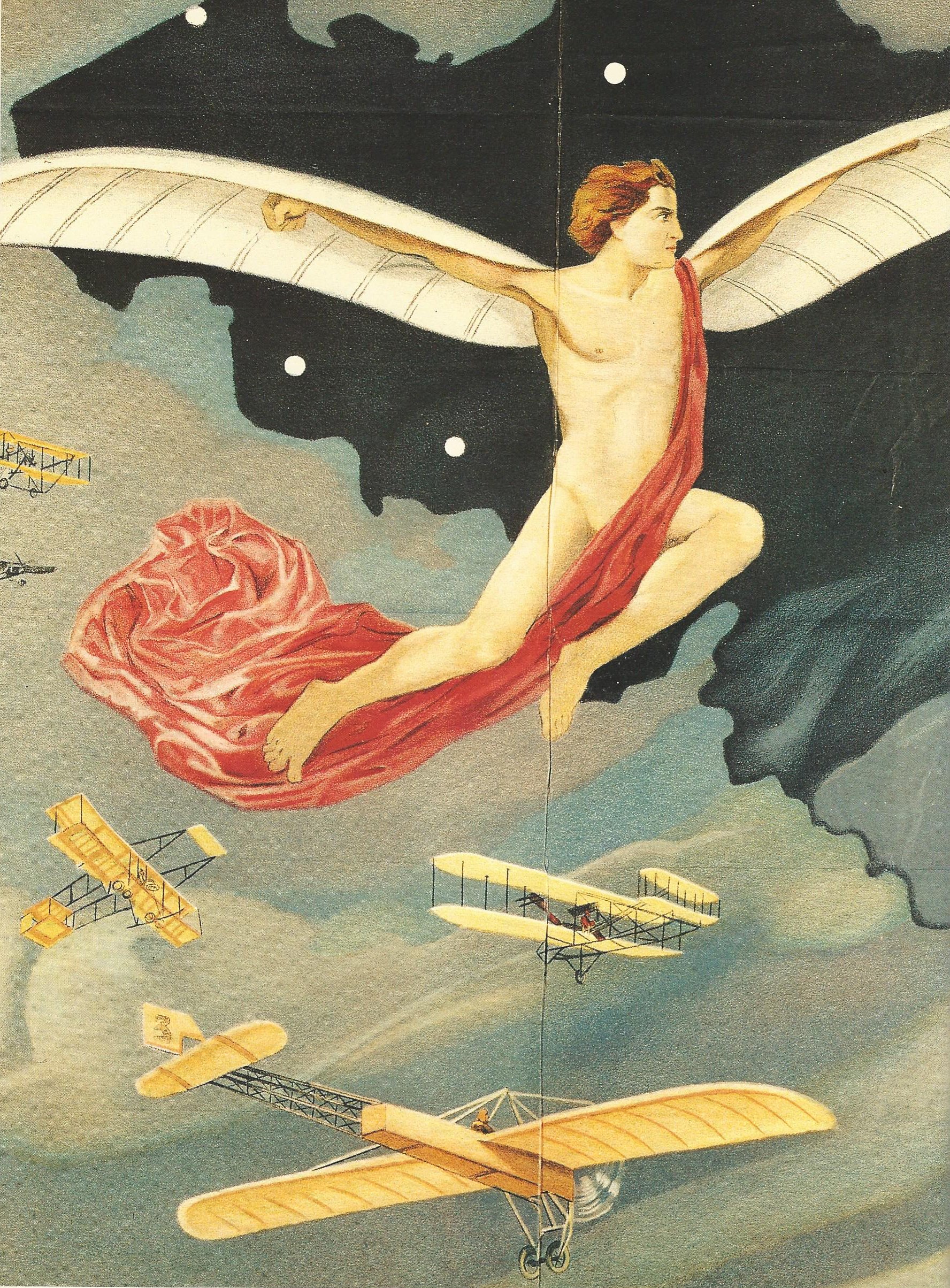 The Wright Flyer is posed immediately beneath Icarus. Below the Wright Flyer is a Blériot Type XI, Escher-like in its tail structure. To their left is a Henry Farman III.