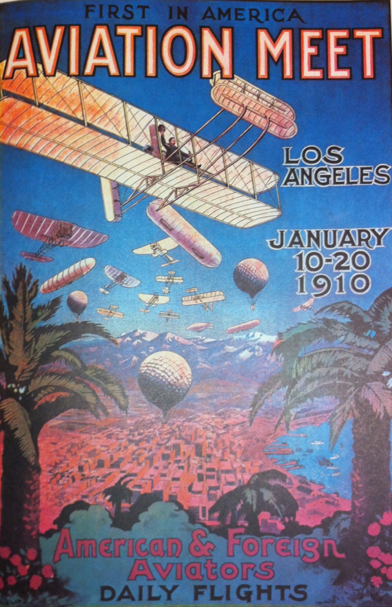 The Los Angeles Aviation Meet, January 10-20, 1910, took place about 10 miles southeast of today’s LAX. The meet included foreign as well as U.S. participants, thus making it the first international air show in America.