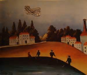 The French painter Henri Rousseau worked in the post-Impressionist movement when he included a Wright in his Pêcheurs à la ligne avec aéroplane (Fishermen with aeroplane), 1908.