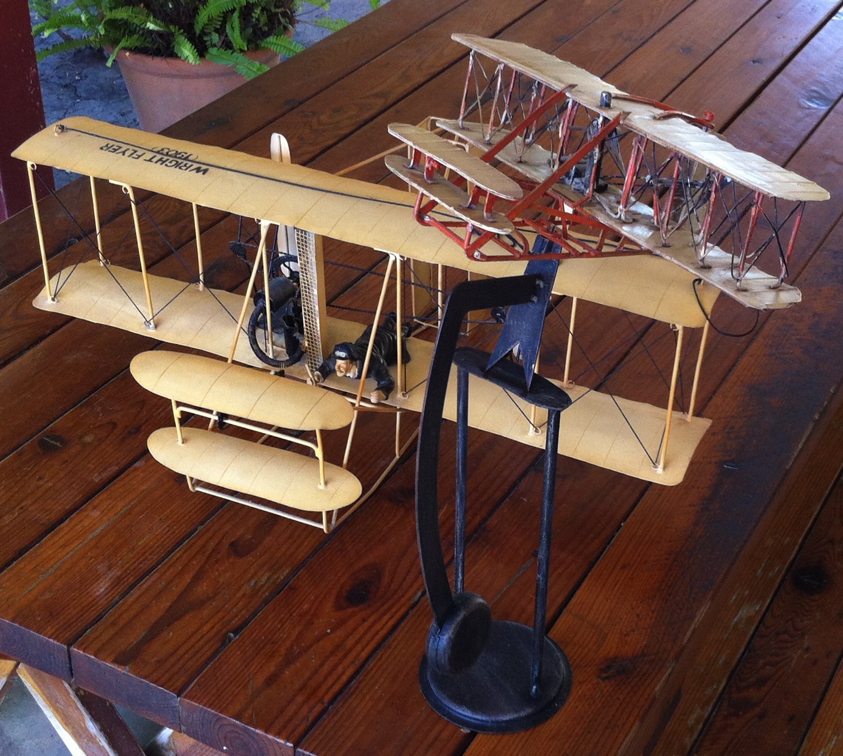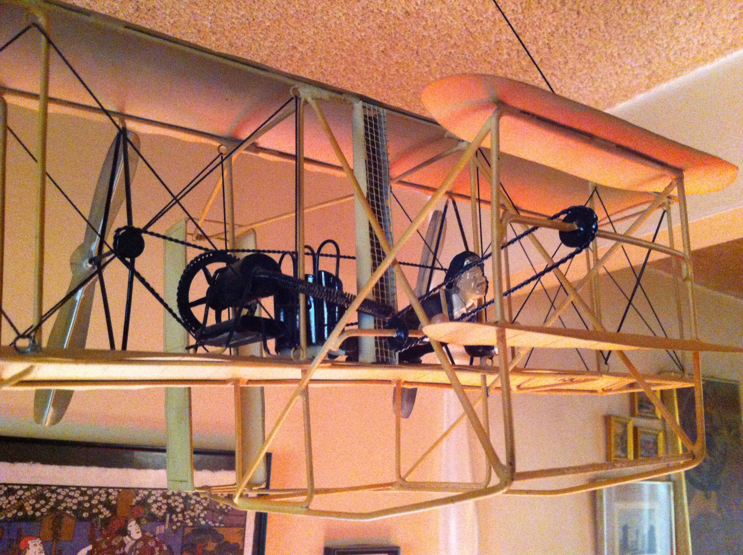 I also have a pair of folk-art Wright Flyers. The one, identified as “made in China; for decoration only,” has its own pedestal for modest mobility. The other is on a larger scale, made in the Philippines.