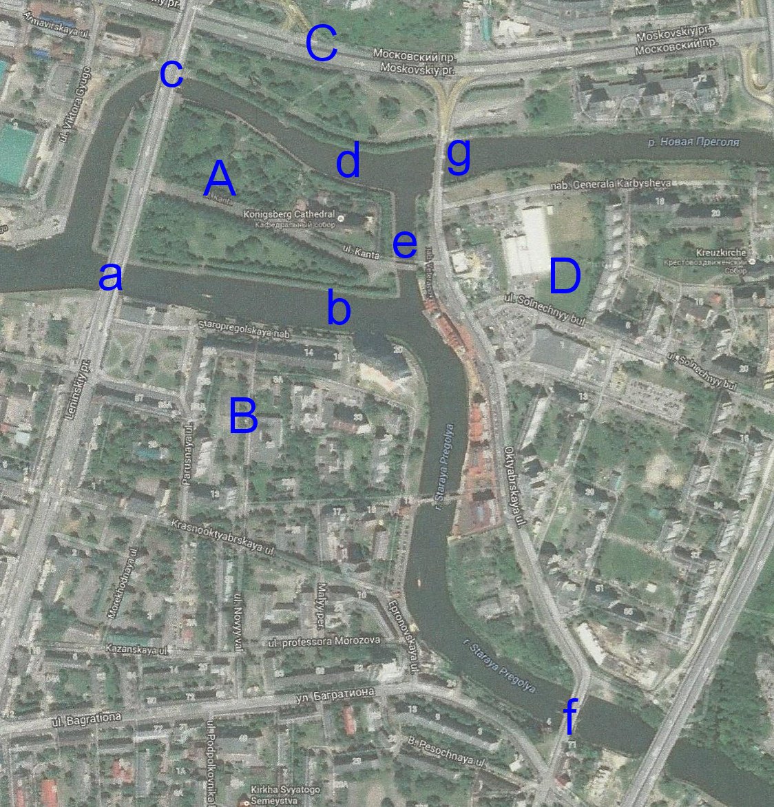 A Google Map of what is now Kalingrad, Russia, shows that, indeed, five of the seven crossings still exist. Two of them, a and c, are the major thoroughfare of Leninsky Prospect. The third bridge, e, is on Kahta Street connecting the larger island D to Königsberg Cathedral on A, the smaller one. Modern bridges g and f are now part of Oktyabrskaya Street. The other two historic bridges, b and d, linking the Cathedral to the city proper, were destroyed in World War II.