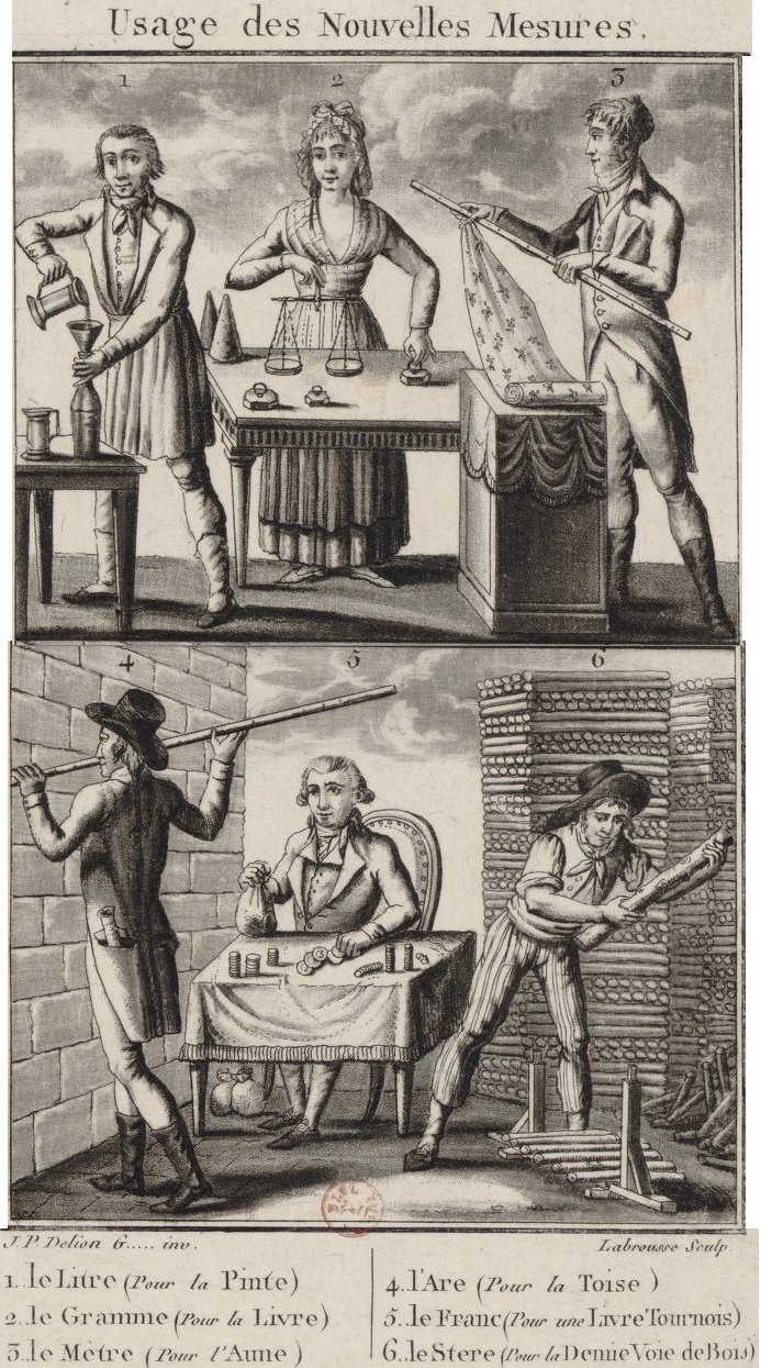 A period attempt to sell the new system, France, c. 1790. I love the way tradesmen and aristos happily interact.
