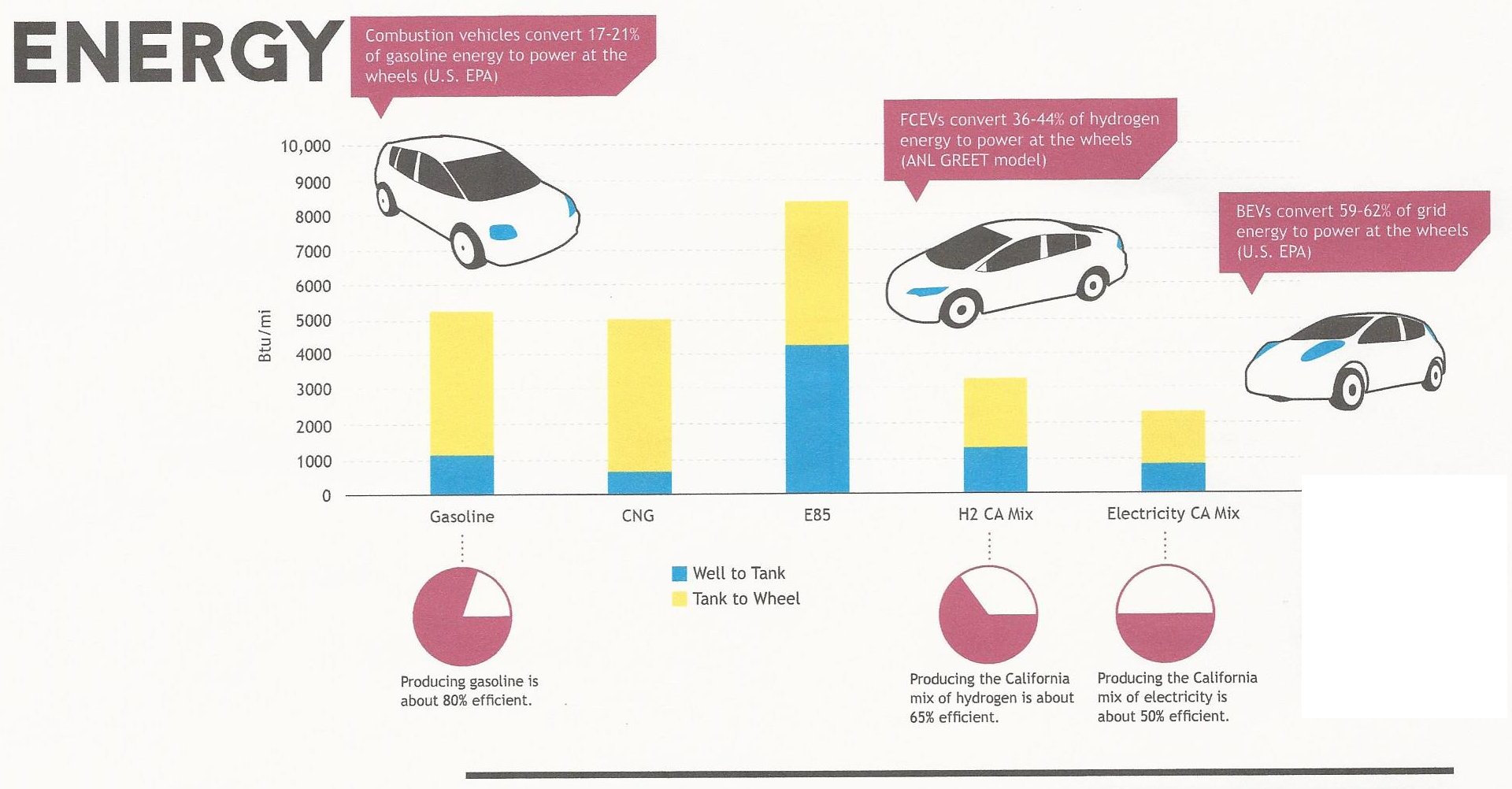 As the term suggests, well-to-wheel analyses encompass the sourcing and production of energy, its means of distribution and its ultimate use. The CaFCP report has analyses of seven aspects, air pollution, climate, energy, water, security, operation and bus transportation. I offer tidbits here from four of them, air, energy, water and operation.