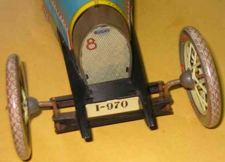 The Bugat is a lithographed tintype, its fabrication of tinplate and details painted by chromolithography. Though the toy is Type-35-esque in its rendering, a close look at its horseshoe-shape radiator shows less than the full Bugatti name.